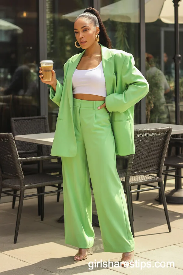 Turn heads at brunch with this bold neon green ensemble! An oversized blazer adds instant edge, while wide-leg pants keep it sleek and comfortable. Pair with a cropped white tank and chunky gold hoops for balance. Finish with strappy heels and a mini bag—perfection for sipping mimosas while serving major confidence. This look screams “main character energy” without sacrificing an ounce of chic. Pro tip: Blazer shoulders = extra attitude. 💚