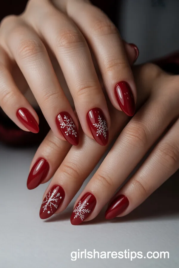 Nothing says holiday glam like deep red almond nails adorned with delicate snowflake art! This chic design combines timeless elegance with festive charm—perfect for holiday parties or cozy nights by the fire. The rich crimson shade adds a touch of sophistication, while the intricate snowflakes bring whimsical winter magic to your fingertips. Ideal for making a statement, this look is equal parts bold and enchanting. Ready to sleigh the season?