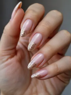 For a subtle yet stunning manicure, try short oval nude nails adorned with chic gold confetti! This timeless combo offers effortless elegance—the neutral base elongates your fingers while the playful gold flecks add just the right amount of sparkle. Perfect for both office meetings and weekend brunches, it’s a low-maintenance look that still turns heads. Pair it with delicate jewelry for a polished finish. Understated? Yes. Boring? Never!