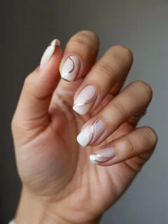 For a timeless yet modern manicure, almond nude nails with gold foil accents are perfection. The soft, neutral base elongates fingers while the delicate gold details add just the right touch of luxury. Whether it’s a subtle stripe or a chic floral accent, the metallic shimmer elevates this look from everyday to effortlessly elegant. Perfect for both office meetings and evening cocktails, it’s a versatile style that exudes sophistication.