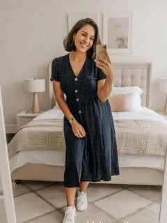 Effortlessly chic, a black t-shirt midi dress is a summer staple for women over 40. Pair it with crisp white sneakers for comfort and a felt hat for a touch of sophistication. This look is perfect for brunch, shopping, or a casual day out. The monochrome palette keeps it sleek, while the accessories add personality. Simple, stylish, and seasonless—this outfit proves timeless elegance never goes out of fashion.