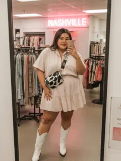 Effortlessly chic, this relaxed white shirt and beige wide-leg trousers combo is a summer staple for women over 40. The crisp shirt adds polish while the flowy trousers keep it comfortable—perfect for brunch or a casual office day. Tuck in the front for a flattering silhouette, add minimalist gold jewelry, and slip into neutral sandals. Timeless, breathable, and endlessly versatile, this look proves sophistication doesn’t mean sacrificing ease.