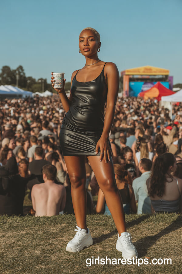 For a cool, effortless vibe, pair a sporty t-shirt dress with bold high-top sneakers—think crisp white Converse or chunky Nike Dunks. This combo balances comfort and edge, perfect for outdoor concerts or all-day festivals. Add a cropped denim jacket or layered necklaces for extra flair. The relaxed fit keeps you mobile, while the sneakers ensure you stay stylish (and blister-free) even after hours on your feet.